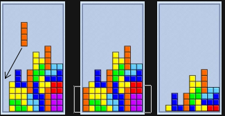 In the game shown at left, a straight vertical piece is falling. If the user drops it in the left most column (picture 1), she will make the bottom four rows full (picture 2), and the full rows will disappear allowing the pile to move down (picture 3).